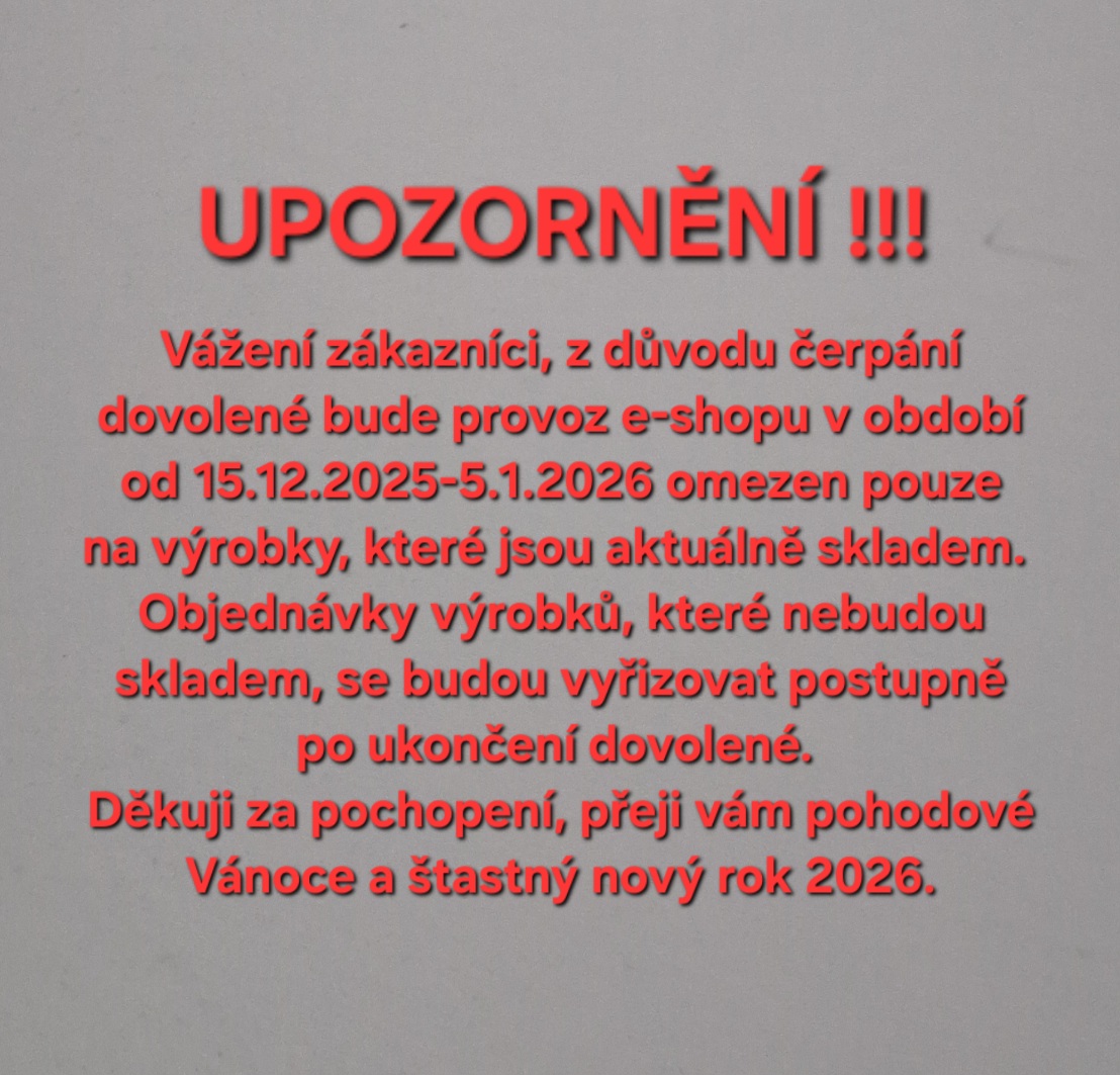 Vážení zákazníci, z důvodu čerpání dovolené bude provoz e-shopu od 15.12.2025-5.1.2026 omezen pouze na výrobky, které jsou aktuálně skladem. Objednávky přijaté v tomto období na výrobky, které skladem nejsou, budou vyřizovány postupně po ukončení dovolené.
